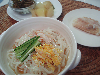 ・冷やしうどん(鶏ささみ、たまご焼き、きゅうりをのせて)
