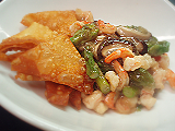 ・アスパラとえびのあんかけ(揚げたワンタンの皮を添えて)
