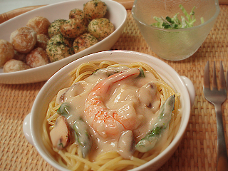 ・えびとアスパラのクリームソーススパゲッティ(マッシュルーム)