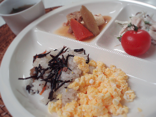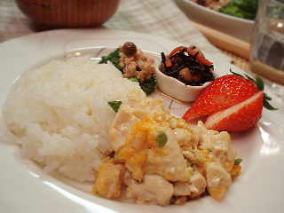 ・炒り豆腐(えび、しいたけ、スナップえんどう、しょうが、たまご)
