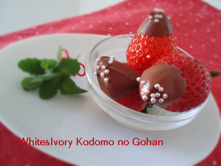 今年のバレンタインは、おやつのイチゴをこんなふうに飾ってみました。