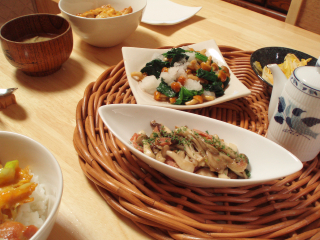・なめこのあえもの(大根おろし、ほうれんそう)