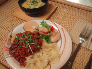 豆は常備菜、ミートソースも先日のを冷凍していたもので…。