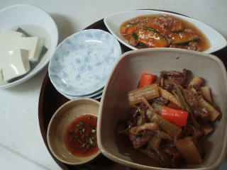 今日も、母が煮て送ってくれた馬肉に、煮物用の山菜水煮や、糸こんにゃく